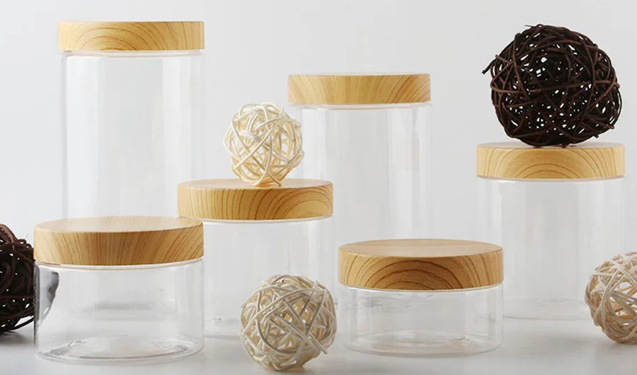 12 x 200ml 300ml 400ml 500ml 800ml 1000ml Empty Clear PET Jars Containers with plastic imitation wood lids