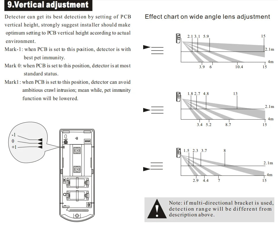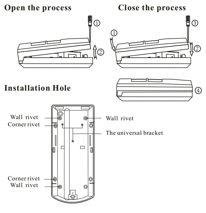 In order to optimize the signal coverage, the detector should be mounted at 2.1m height and vertically adjusted to zero point. Make sure there are no interference sources working near the detector and that there is a wide field of view in front of the detector. Unscrew, remove the front cover, and pull out the circuit board. Drill through the mounting blind hole, make a mark on the wall, drill a 40mm deep hole with a 6mm diameter drill bit, then punch the rubber plug into the hole, let the screw into the 5-6 mm, then thread the wire through the cable hole, and fix the bottom cover to the wall, finally tighten the screw.