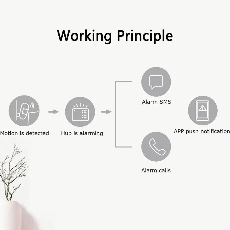 2.When any movement is detected, the sensor will send alert signal to the alarm hub, then alarm calls&SMS, APP alert notification will be sent to your mobile phone.