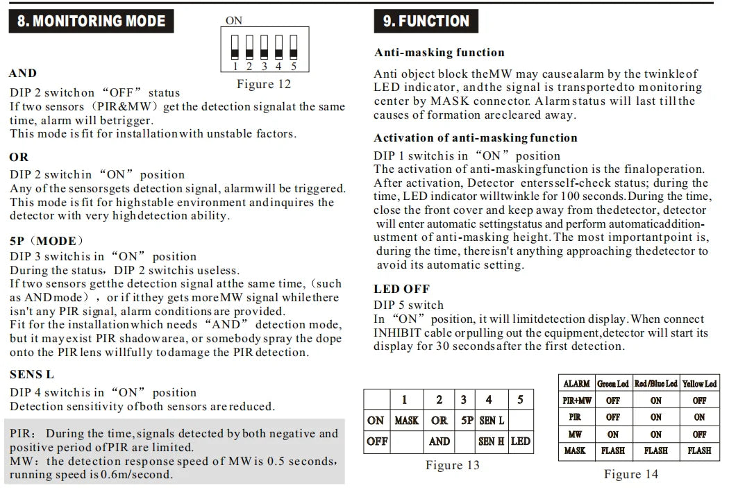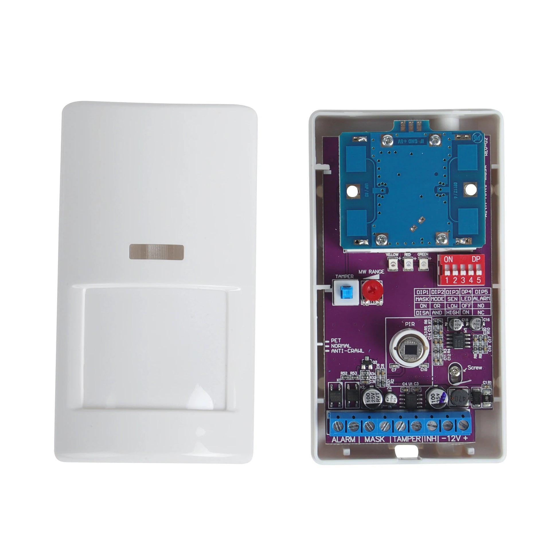lt is a dual-tech motion detector, it is organized by 2 sensors:dual element PIR & Transportation style Microwave. 2 sensors are controlled by a 8 bit microprocessor,microprocessor offers a optimization process to the sensors by intelligent signal processing soft ware technology.The advantages of it are:can offer 3 kinds of detection modes on 2 sensitive grades in order to select the more perfect and wider detection way for the special needs of protection site; it gets the best rate between the best detection and minimum false alarm.Including the normal“AND”“OR”modes, this is also with“5P” mode in order to avoid the damage caused by spray dope on its lens.On the side, this is with other functions such as automatic setting on anti masking,This product can be used in warehouses, offices, factories,hotels, banks and other places.