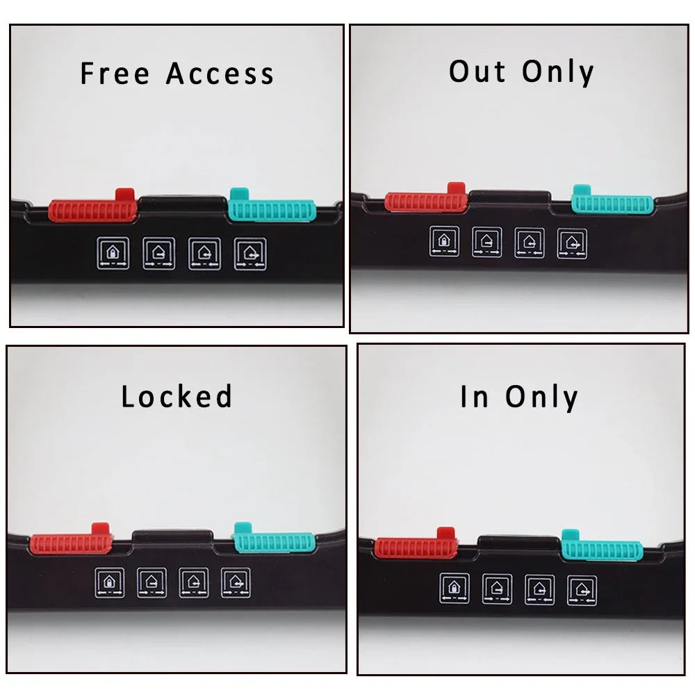 Turn Red and Green switches to left side, pet is allowed to exit house but prevent from entering house.
