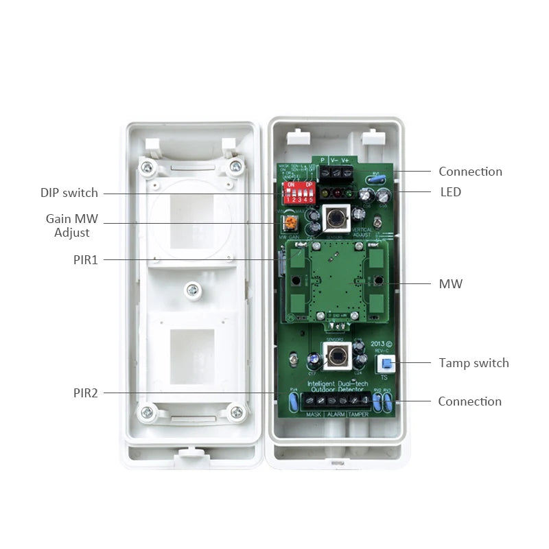 This wired outdoor motion detector includes 2 PIR+MW. It is waterproof for outdoor protection, with and/or selection and "B" mode helps it to avoid PIR distance shorting cause by temperature. Its anti-mask function makes it more safety than normal detector.Pet immunity up to 25kg. Fit for commercial/residential area,factory,hotel,bank,apartment,villa,farm etc...