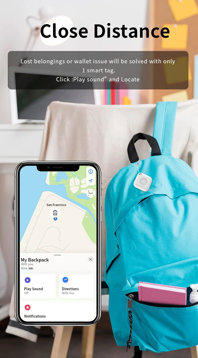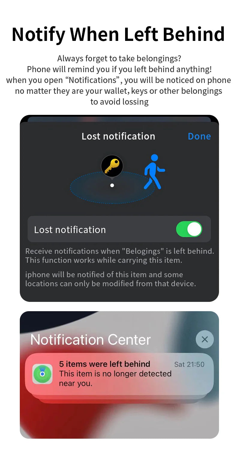 【Left-Behind Reminders】Ever left your wallet or luggage behind in a rush? Our tracking tag's left-behind reminder feature ensures that you never forget your belongings again. If you move away from your tracked item, your smartphone will send you a notification, reminding you to retrieve it before it's too late.