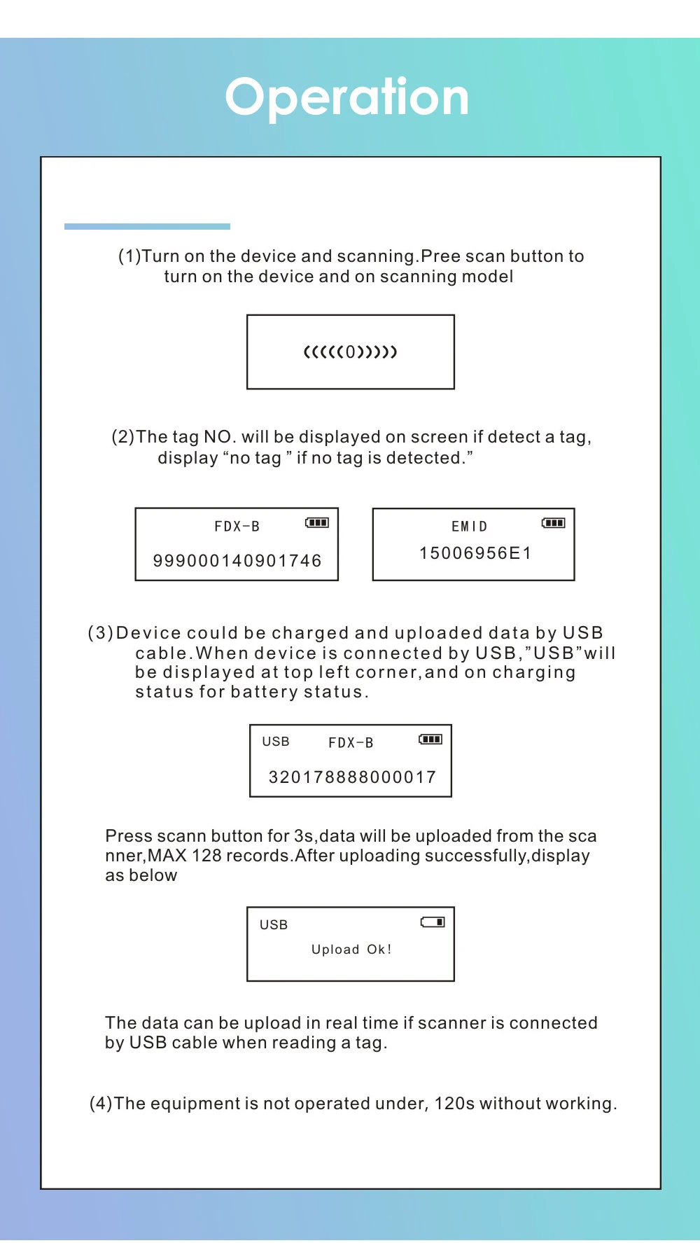 Reading Distance: >15cm for 30mm ear tags, >5cm for 2*12mm glass tag