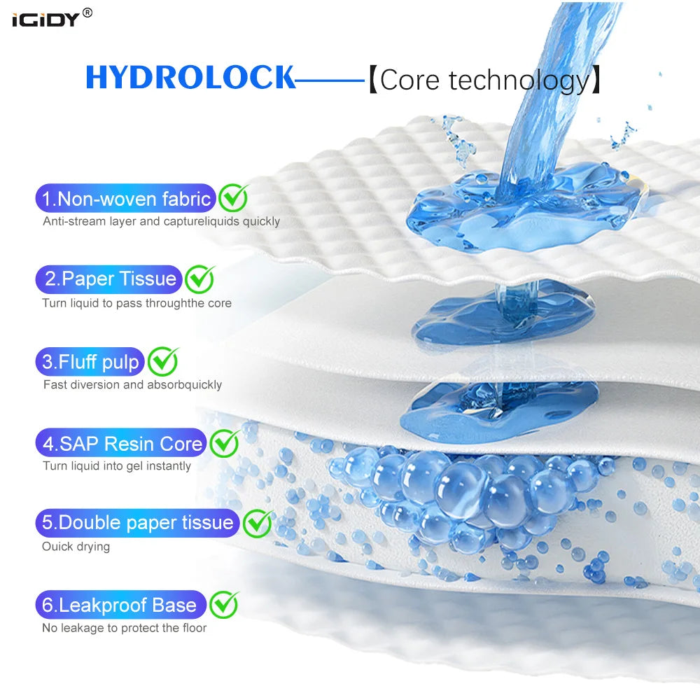Surface high-quality non-woven fabric + imported wood pulp core + Japanese Sumitomo polymer water-absorbing resin (SAP), absorption speed <3 seconds, water lock up to 150 times its own weight, completely solve the problem of urine reverse osmosis, the surface is dry and non-sticky.