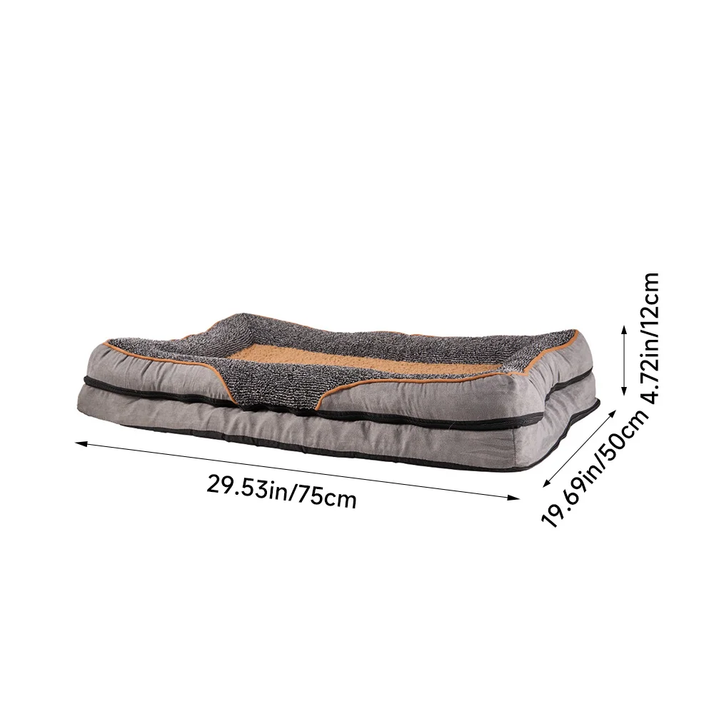 This pet bed is designed to give your pet a more comfortable resting experience. The edges of the bed are wrapped in stylish and durable pseudo-suede, which not only adds to the beauty of the bed, but also provides additional wear-resistant protection. The interior is covered with plush to keep your pet warm and cozy, allowing your pet to sleep peacefully in the cold winter. In addition, the bottom of the bed is filled with high-density sponge, providing excellent support, effectively reducing the pressure on pet joints, helping it relax and get a better sleep.